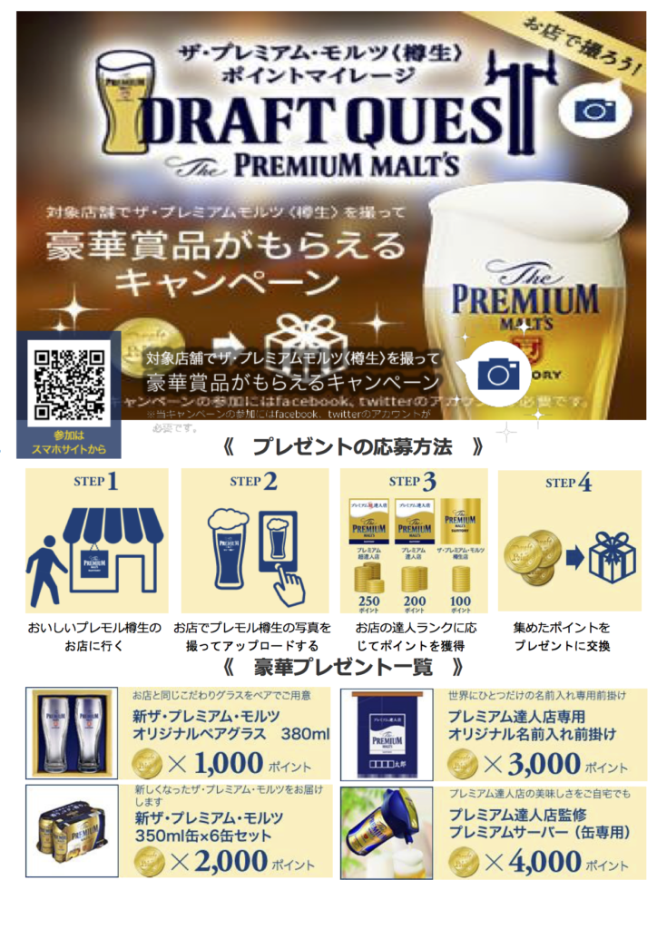 対象店舗でザ・プレミアムモルツ<樽生>を撮って豪華商品がもらえるキャンペーンをご案内させて頂きます。