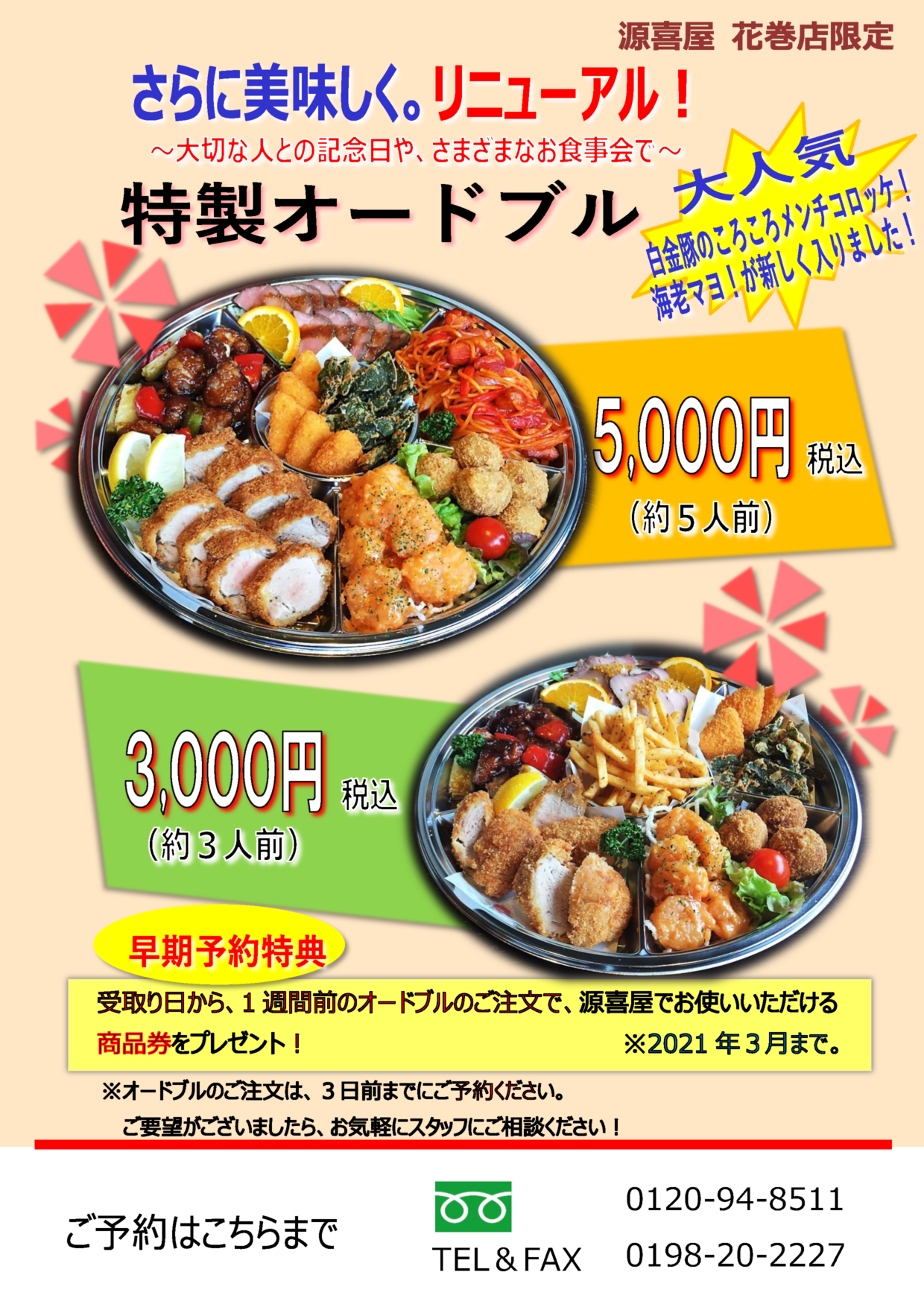 お得に!そして、自慢の美味しい『特製オードブル』を大切なご家族や、ご友人と、ぜひお楽しみください。