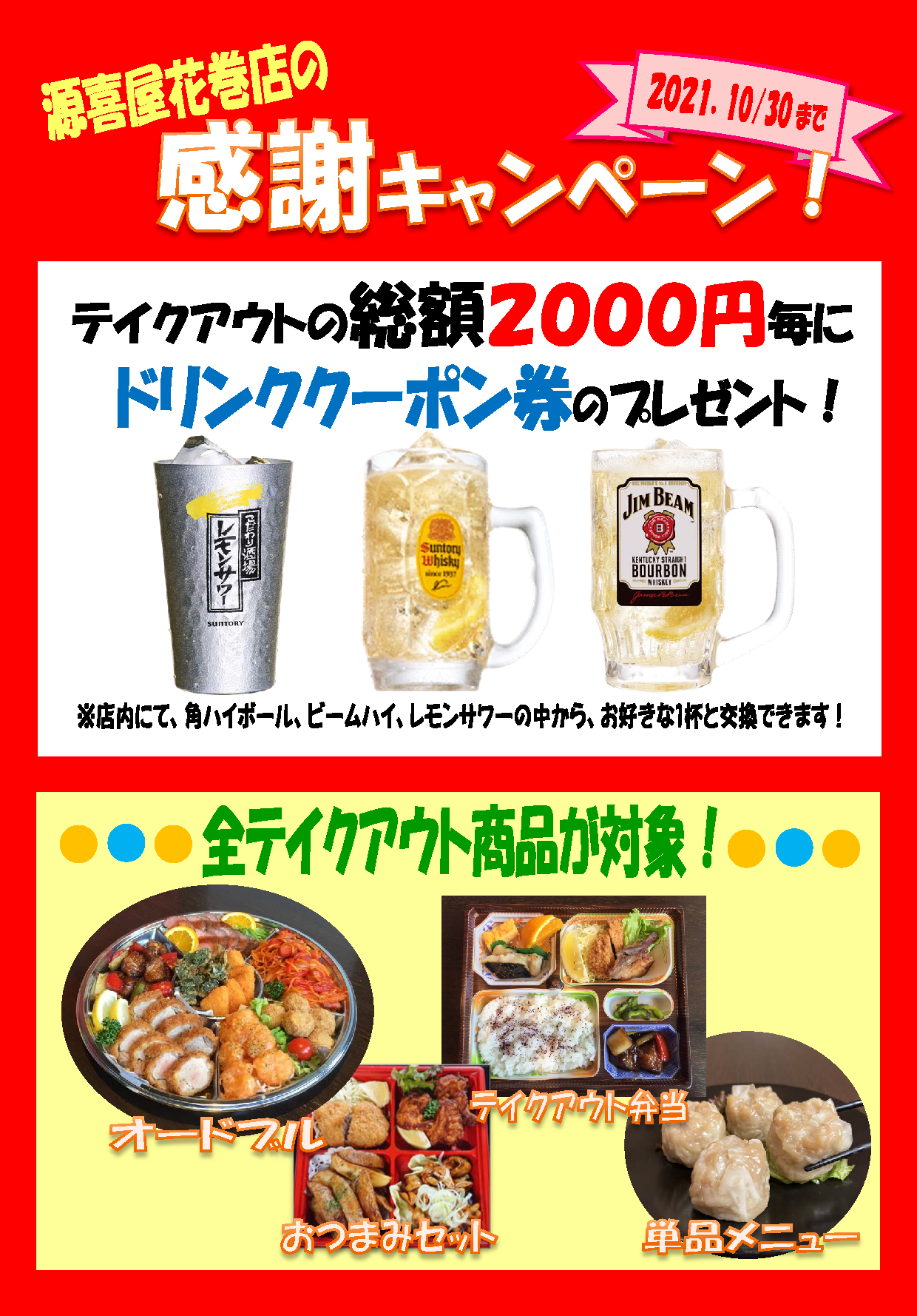 テイクアウトの総額2000円ごとに、お店で使えるドリンククーポン券を1枚プレゼント!(※期間は2021/10/31まで)