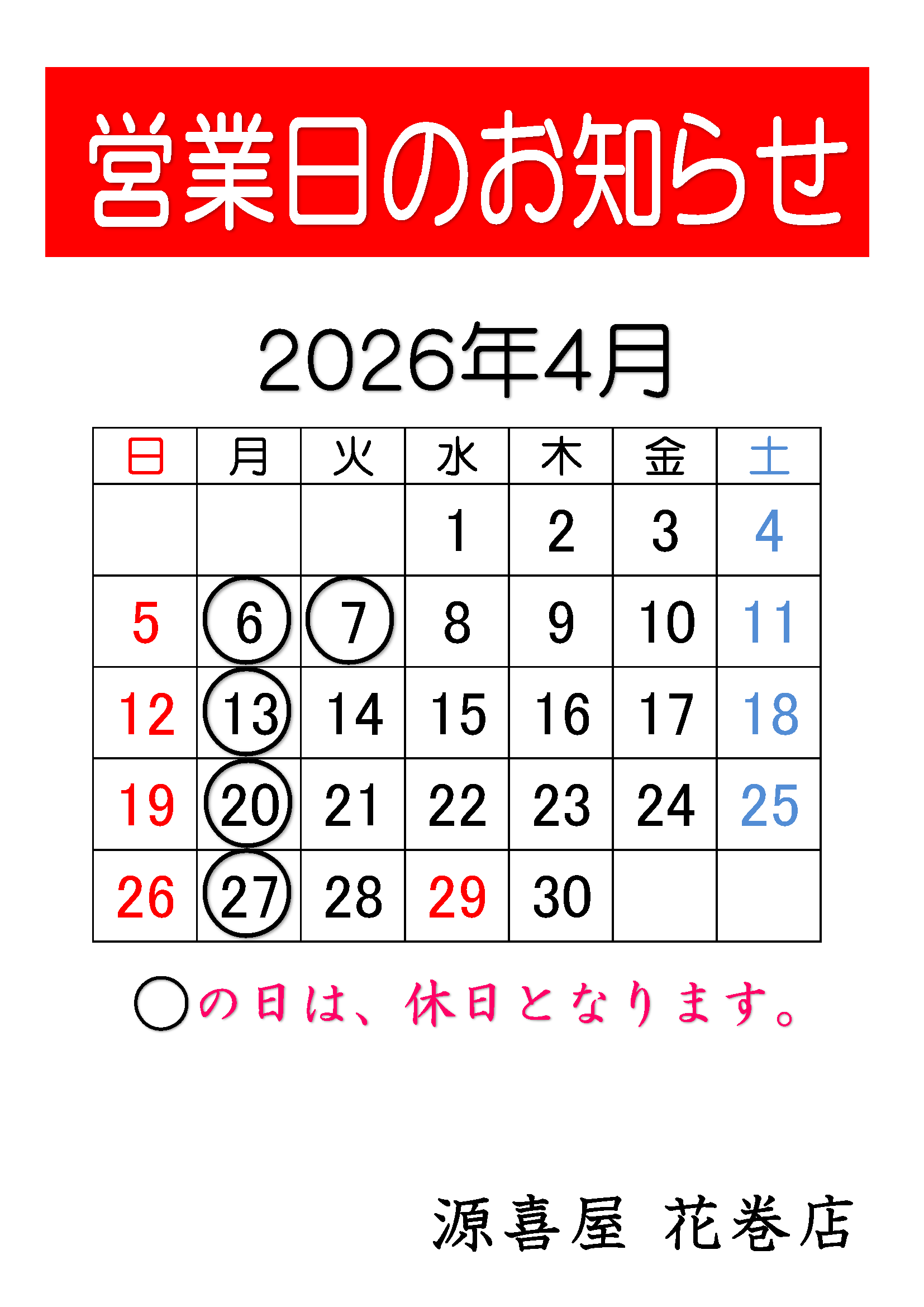 いつも源喜屋花巻店をご利用頂きありがとうございます。