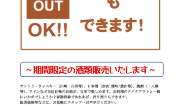 いつも源喜屋花巻店をご利用頂きありがとうございます。期間限定で、当店取り扱い銘柄の酒類販売をさせて頂きます。サントリーウィスキー(山崎・白州等)、日本酒(赤武 雄町/愛山等)、焼酎(一人蔵 等)、ワインなど当店自慢のお酒が、自宅で楽しめます。お料理のテイクアウトと一緒 にいかがて…
